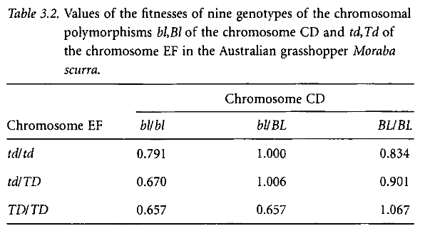 The first table illustrates the fitness values (how evolutionary fit) of given combinations of particular genotypes in this grasshopper. A higher value is a higher chance of surviving and passing on those particular combinations, and vice versa. One genotype is not universally preferable; its fitness always depends, in some complex relationship, on the other gene as well.