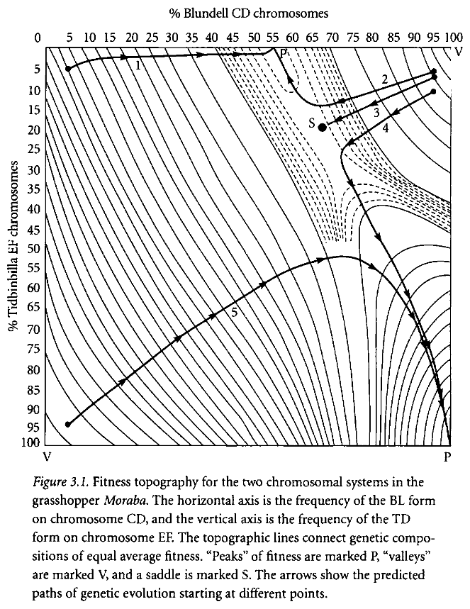 The second table illustrates the same point, with genes represented as percentages of the population rather than as specific combinations. The arrowed lines show the movement of the population average given various starting points; ie, change in genotype distribution over time. If, for example, if a population of grasshoppers began with a genetic makeup mostly possessing the TD/TD and bl/bl genotypes, (the bottom left corner), natural selection will produce first a population mostly consisting of td/TD and bl/BL genotypes, and only then for the more desirable TD/TD and BL/BL genotypes! It is not possible to move linearly from bl/bl to BL/BL, because the intermediate combination has a very low level of fitness. Similarly, given other starting points of genetic variation, it may be impossible to move to the most fit genetic type; this is the situation illustrated by the lines of motion in the top half of the diagram.